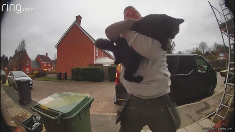На уморительных кадрах, снятых камерой видеонаблюдения, Маккендри медленно приближается к коту и зовёт его Берти. Затем быстро хватает четвероногого и бежит к дому. Тут он обнаруживает, что дверь заперта.