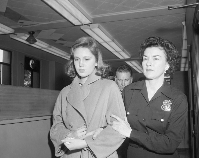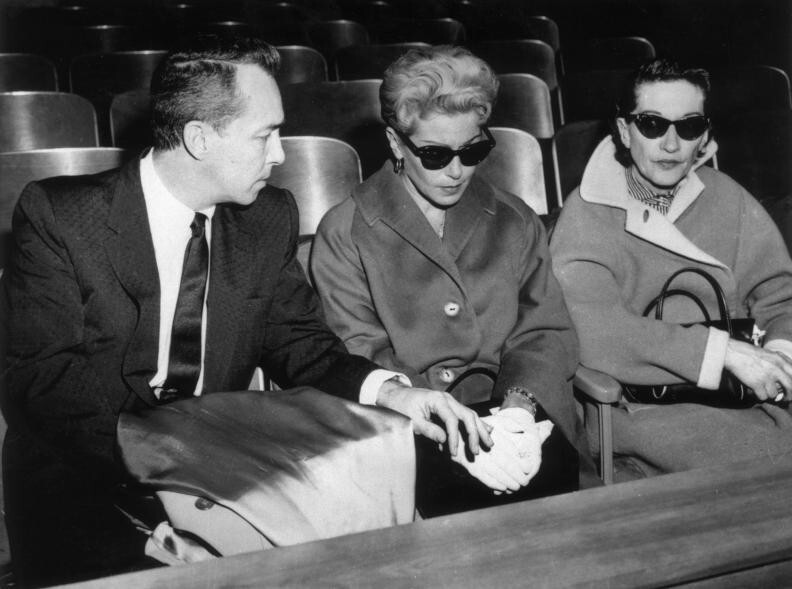Актриса Лана Тёрнер (в центре) с бывшим мужем Стивеном Крейном во время суда по делу об убийстве гангстера Джонни Стомпанато