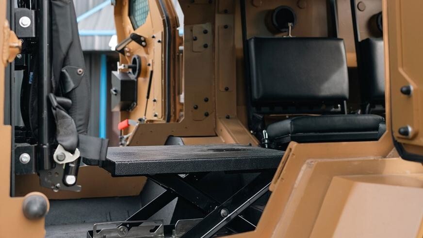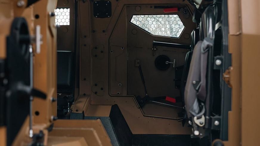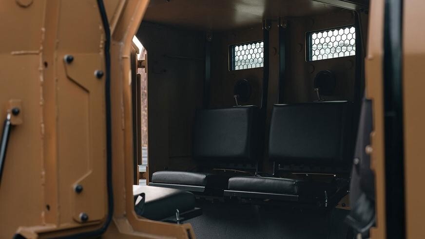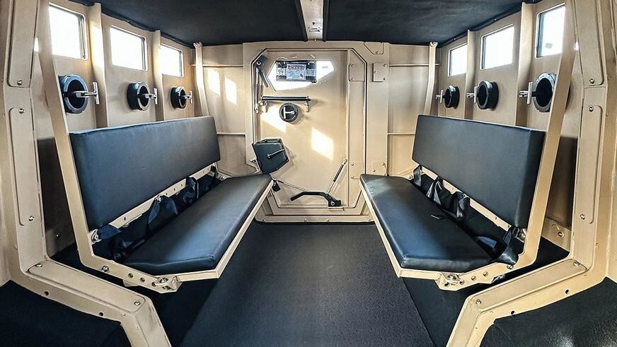 Goat Tactical предлагает для броневика сразу несколько вариантов архитектуры интерьера по выбору заказчика: от простых лавок вдоль бортов для девяти пассажиров, включая водителя, до индивидуальных кожаных кресел и дорогой отделки.