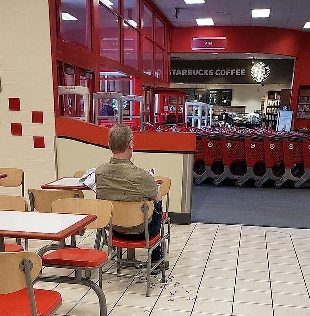 Взрослый мужчина сидит разбрасывает обертки от конфет, которые мне придется подбирать.