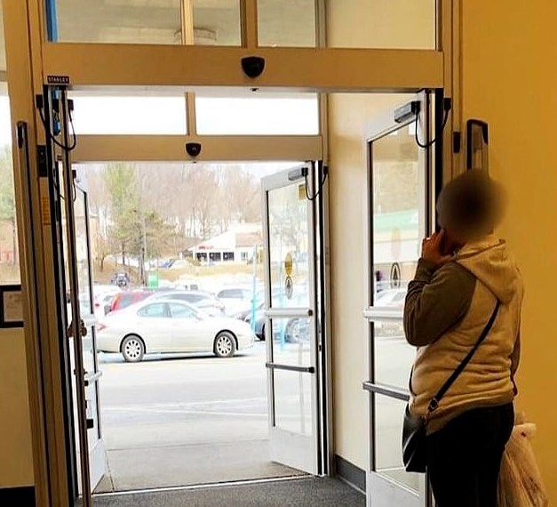 Эта женщина минут 10 стояла у автоматических дверей и болтала по телефону. На улице минусовая температура.