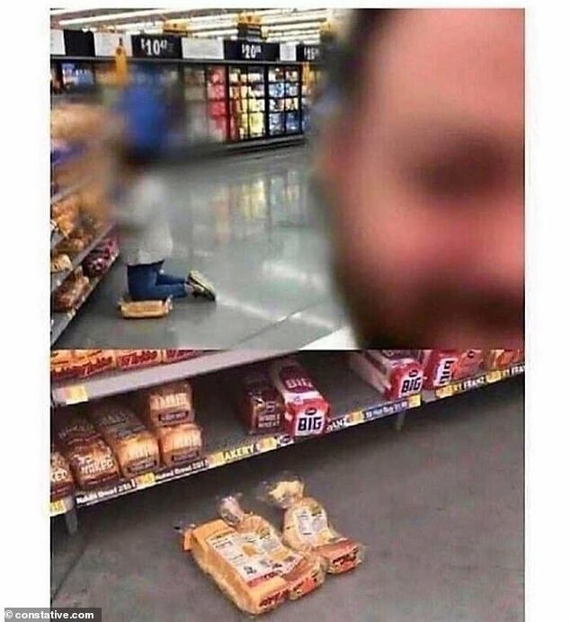 9. Женщина в магазине встала коленями на хлеб, что рассмотреть полки с другим хлебом