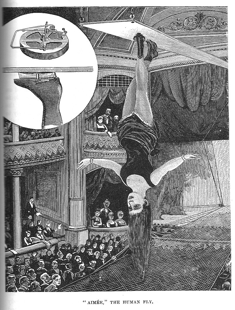В книге «Магия: сценические иллюзии и научные диверсии» 1897 года описана как раз такая уникальная артистка, известная под сценическим псевдонимом Эме – человеческая муха. Она начинала свое выступление, сидя на трапеции лицом к зрителям, как это делает любой акробат. Затем девушка откидывалась назад и поднимала ноги вверх, пока они не достигали семиметровой доски, подвешенной к потолку. Вооружившись пневматическими приспособлениями на подошвах обуви, она прикрепляла ноги к доске и покидала трапецию. Свесив голову и волосы вниз, артистка делала уверенные шаги на присосках назад и проходила всю длину доски, затем поворачивалась и шла обратно.