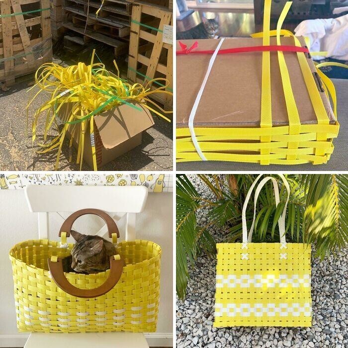 1. "Я подбираю пластиковую упаковочную ленту, которую выбрасывает строительный магазин, и плету из нее прочные и модные сумки"