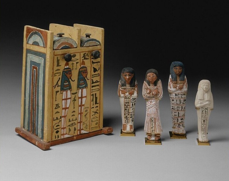 Фигурки ушебти в Древнем Египте помещались в могилу, и были призваны помочь умершему в загробной жизни. В зависимости от гробницы, человека могли похоронить с сотнями таких фигурок. Простые делали из керамики, а более сложные ушебти — позолочены. На фигурки обычно наносилось заклинание для их магического оживления в загробной жизни. Они также изображались с инструментами в руках и корзиной через плечо, готовые выполнять любые задачи в загробном мире.