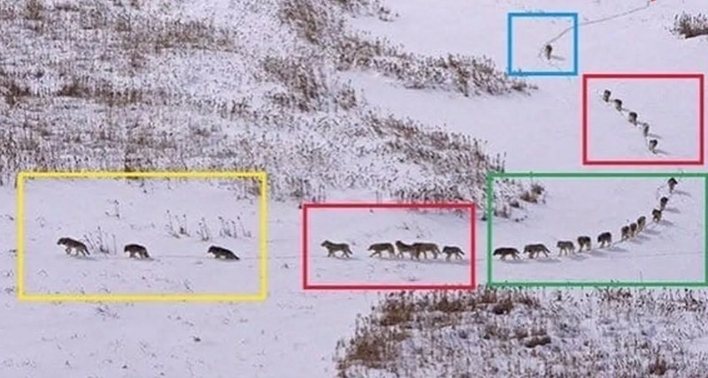 На фотографии: передвижение стаи волков: первые трое (желтая рамка) - старые или больные, они идут впереди и задают скорость всей стаи. Если они пройдут сзади, то отстанут и погибнут. За ними идут пятеро сильных волков (красная рамка). В центре (зеленая рамка) - остальные члены стаи, потом - пятеро самых сильных (красная рамка). Последним идет вожак, который контролирует всю стаю. Стая идет так, чтобы самые старые не отставали, и чтобы иметь возможность помочь друг другу.