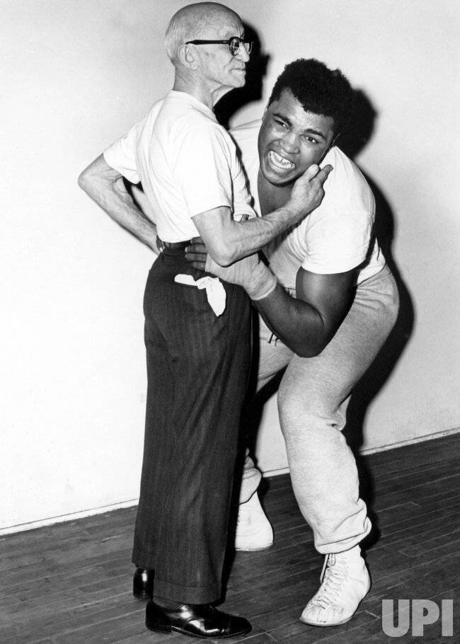 33. Мухаммед Али пытается поднять 76-летнего бывшего чемпиона мира по боксу в легчайшем весе Джонни Кулона. Он владел особым приемом: стоило ему положить палец на шею и запястье противника, тот уже не мог оторвать его от земли.