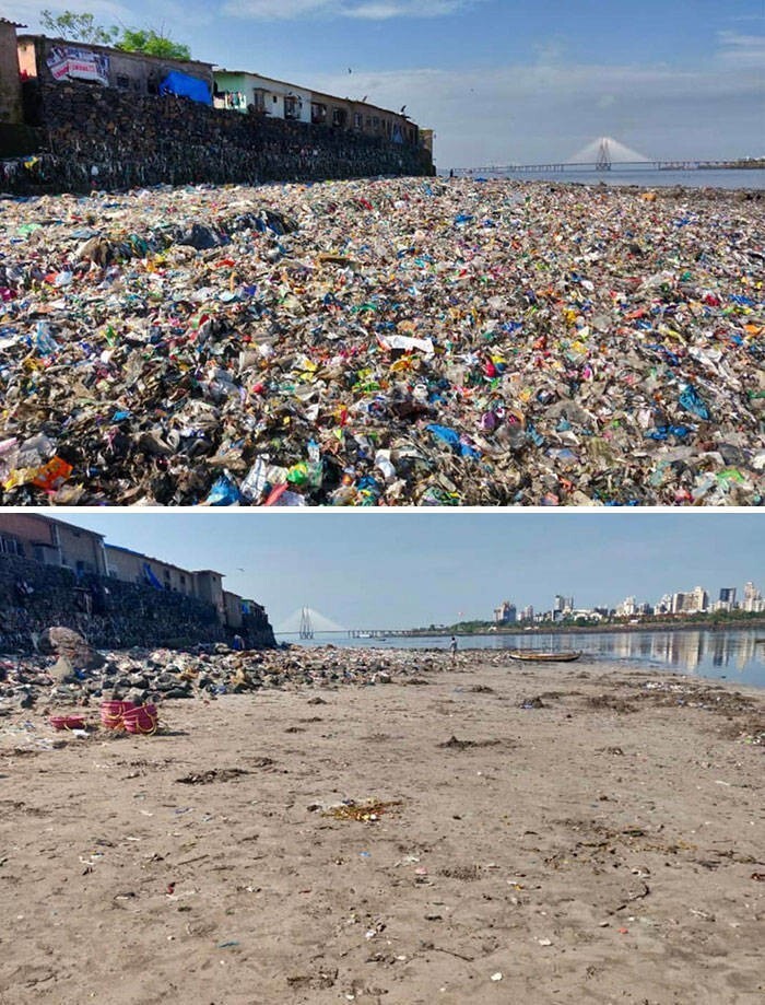 43. Фото пляжа в Мумбаи до и после уборки, организованной юристом Афрозом Шахом