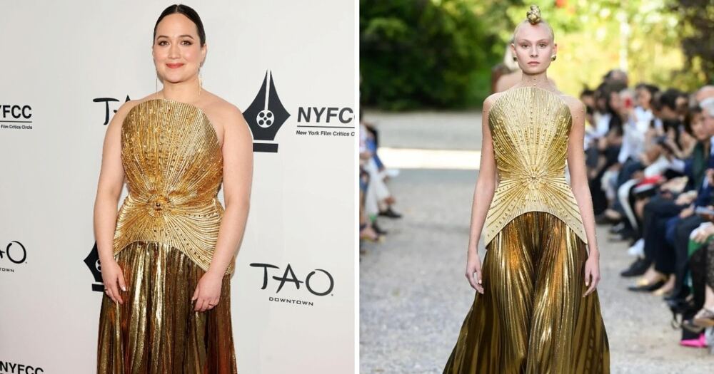 Платье, которое отлично село на два совершенно разных типажа. Но фигура актрисы выглядит более подчёркнутой, чем на модели.
