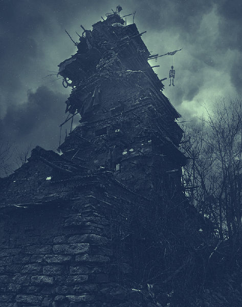 Ночью дом выглядит так, и его изображение любят использовать в различных коллажах на тему ужастиков. Видите висящего скелета в правой части здания?