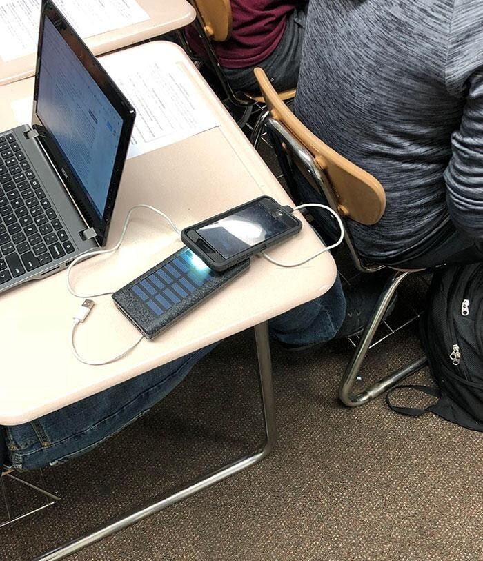 10. Студент заряжает портативную солнечную батарею фонариком с телефона, чтобы потом зарядить телефон
