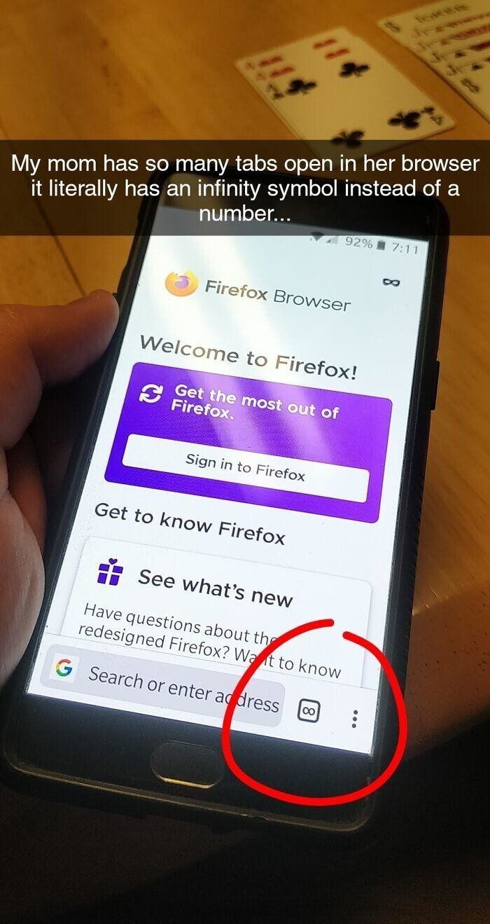 5. "У мамы открыто столько вкладок в браузере, что он буквально показывает знак бесконечности вместо количества"