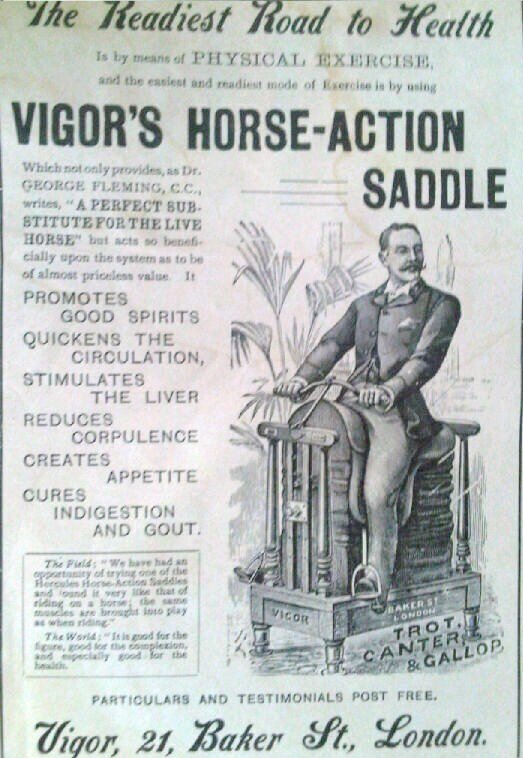 И именно для лечения сплина изобрёл Генри Марш комнатного конька. Теперь леди и джентльмены могли скакать на лошадях в любую погоду, даже не выходя из дома! Они садились на вот это устройство, держались руками за поручни, и… скакали, скакали, скакали!