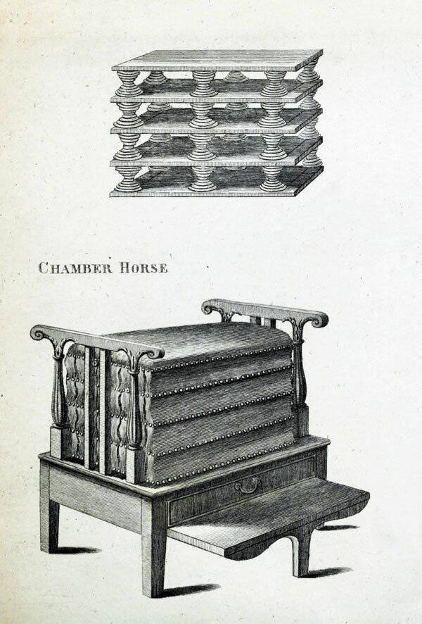 Вот комнатный конёк, нарисованный инженером и дизайнером Томасом Шератоном в 1792 году. Здесь хорошо видно его внутреннее устройство.