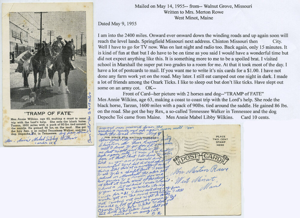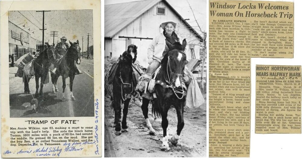 Женщина заложила свою ферму и на вырученные деньги купила прекрасную верховую лошадь по кличке Тарзан. В ноябре 1954 года она надела мужские брюки, взяла немного вещей в дорогу, и отправилась в Калифорнию верхом на лошади со своей маленькой собачкой.