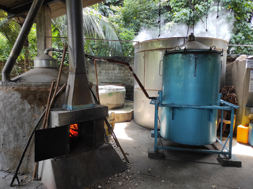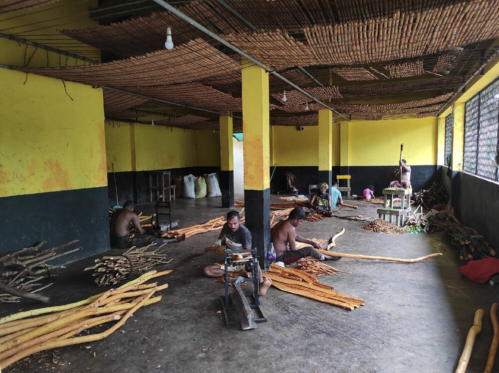Выпаривание масла. После снятия коры стволы корицы идут в печь.
