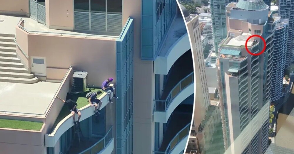 Мальчишки устроили посиделки на карнизе элитного жилого здания Admiralty Towers II на Куин-стрит в Брисбене. Очевидец Бенджамин Еремая снял пугающие кадры в прошлую пятницу.