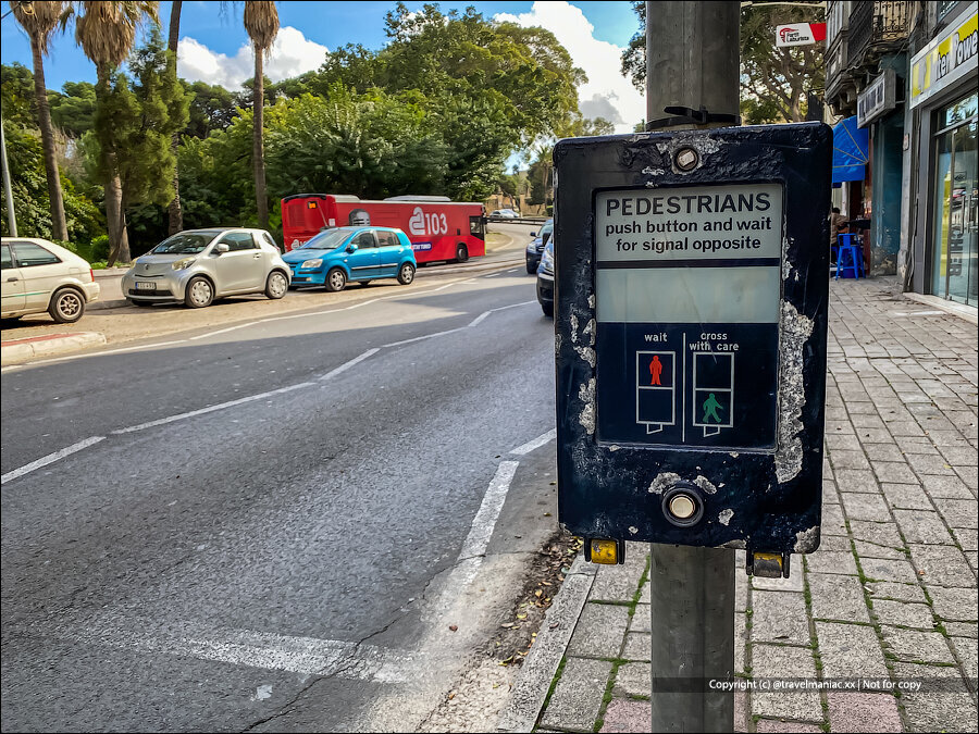 Как правило, эта необычная ломаная разметка начинается за 50 метров до пешеходных переходов, которые на Мальте практически оборудованы кнопочным управлением: постоянно горит зелёный светофор для водителей, чтобы не останавливать поток попусту, а красный загорается только тогда, когда желающий перейти дорогу нажмет кнопку на столбе.