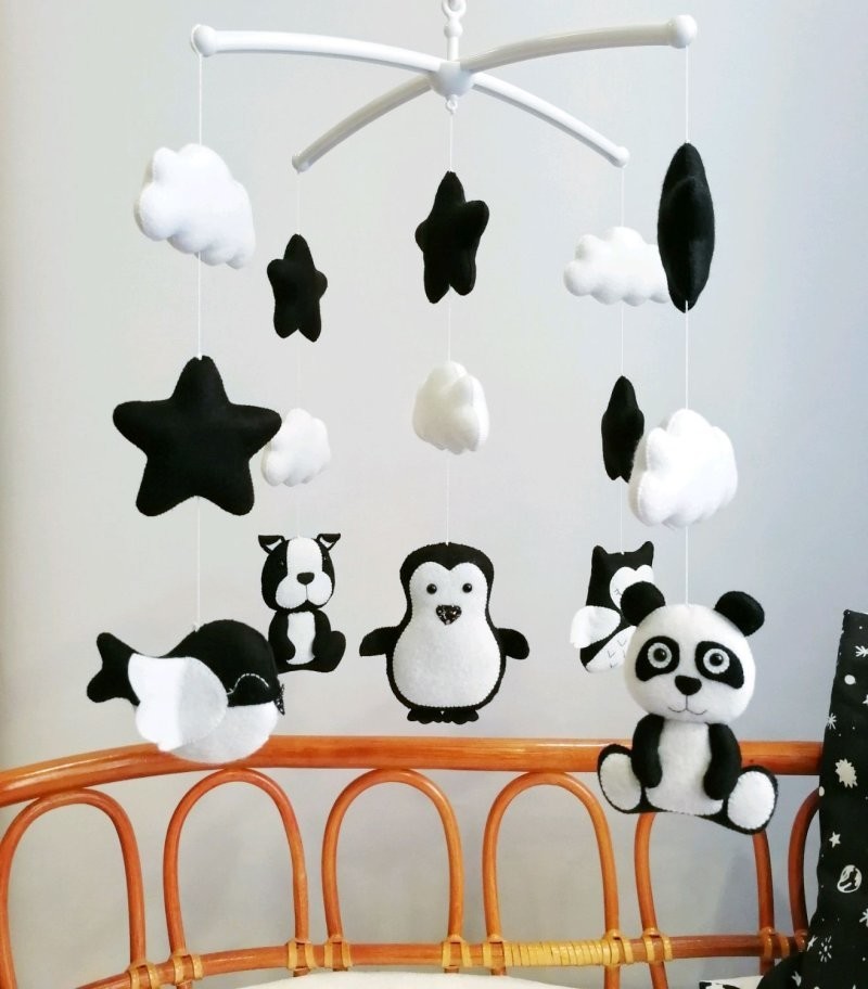 Как бы мамочкам (да и многим папам тоже) не хотелось окружить себя "природными" цветами, но всё дело в том, что ребёнку необходимы яркие цвета. Было проведено множество исследований, благодаря которым теперь мы знаем, что сначала малышу легче воспринимать чёрно-белое сочетание. Это успокаивает грудничка и усиливает его внимание. Поэтому мобиль в кроватку лучше выбирать с игрушками чёрно-белых цветов.