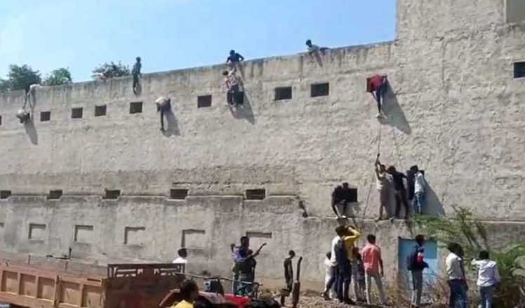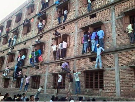 Все мужчины на этом фото лезут через… стены школы в индийском Харьяне, чтобы передать шпаргалки сдающим экзамен ученикам!