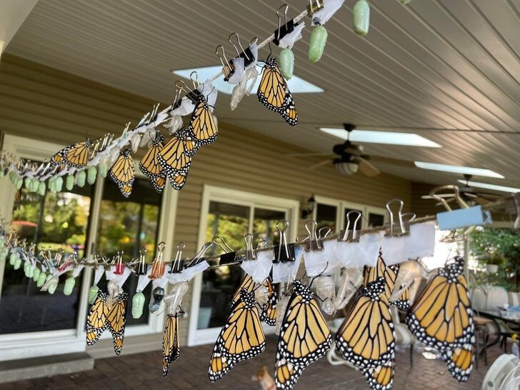 34. Бельевые веревки с куколками, из которых вылупляются бабочки