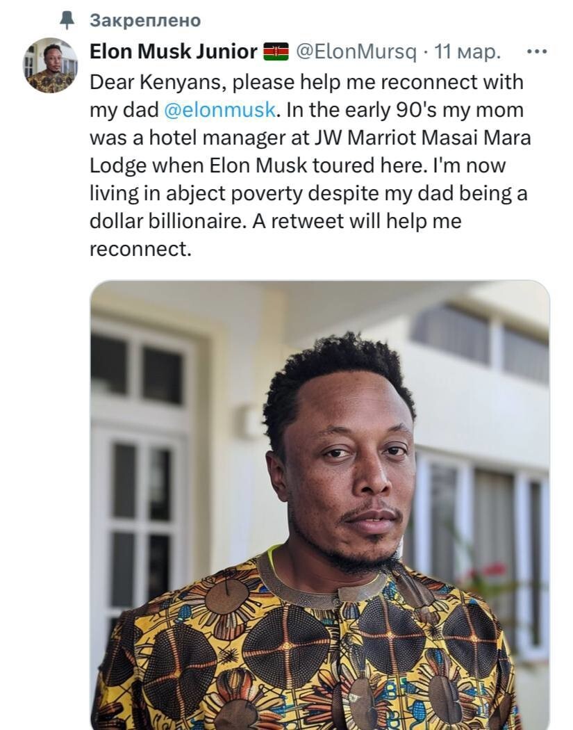 Якобы, в 90-х Илон Маск остановился в кенийском отеле, где мать его будущего чернокожего "сына" работала менеджером. Там долларовый миллиардер и зачал чернокожую копию самого себя.