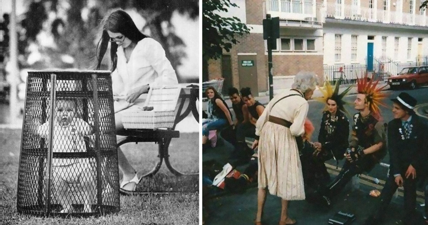 34. Женщина держит ребенка в урне, пока вяжет крючком в парке, 1969 год