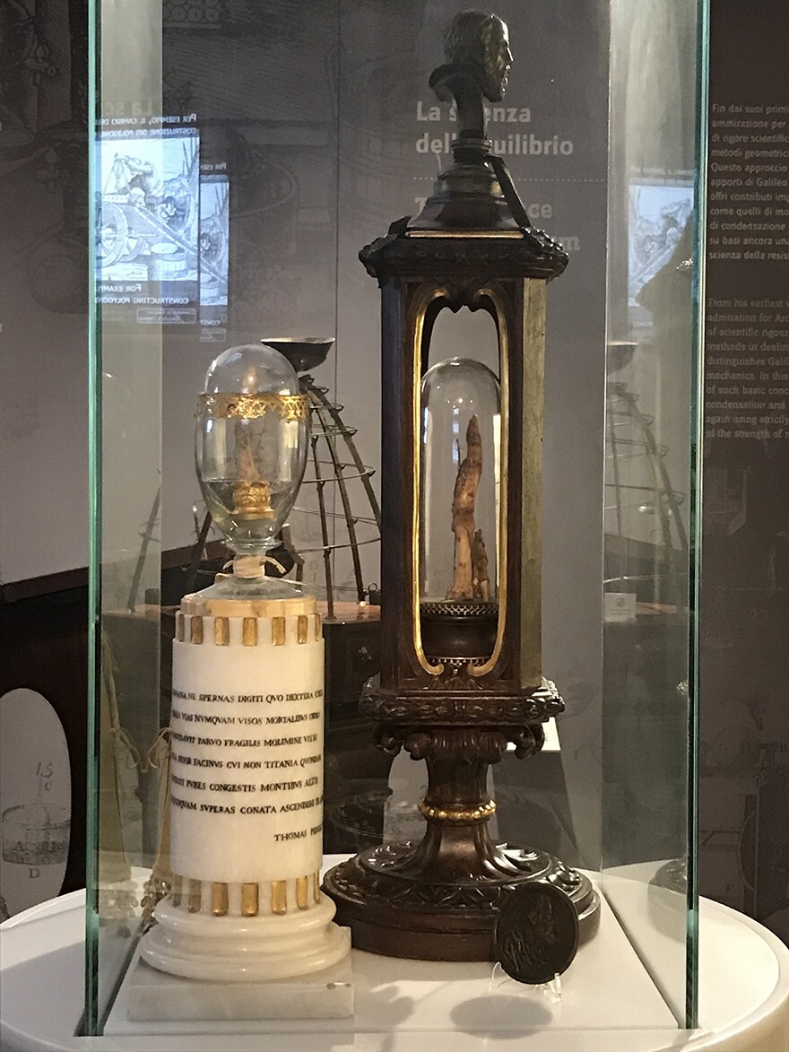 Два пальца (указательный и большой палец правой руки) и зуб осели у маркиза Каппони. Он поместил их в прекрасный стеклянный сосуд, заключённый в деревянную шкатулку с резным изображением Галилея. Реликвии передавались из поколения в поколение как святыня.