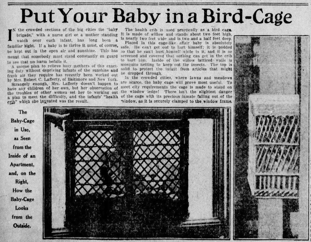 В 1884 году Лютер Эммет Холт в своей книге «Уход и кормление детей» написал о важности «проветривания» младенцев. Это утверждение привело к появлению, пожалуй, одного из самых странных изобретений XX века – детских клеток.