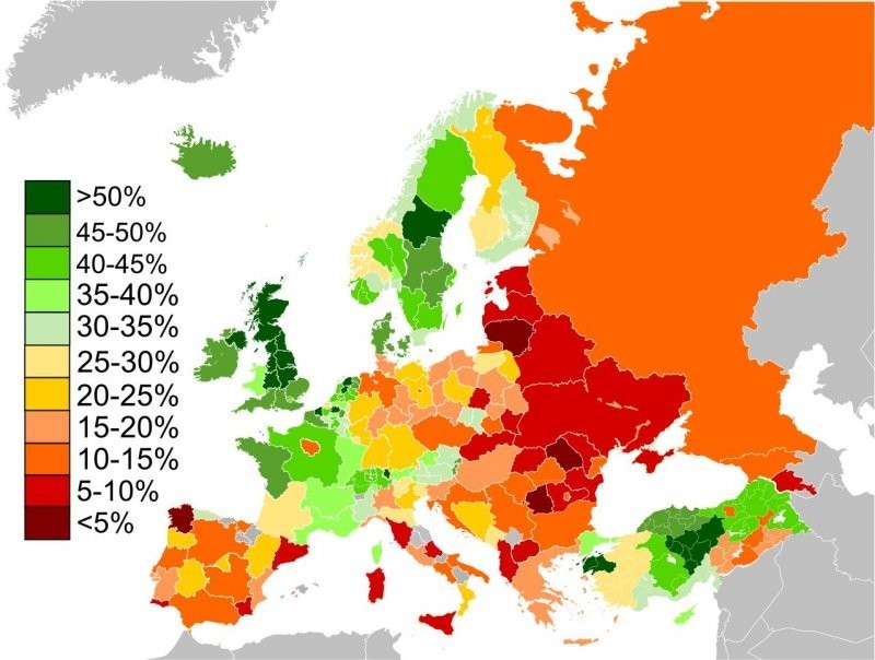 20. Доля людей в Европе, назвавших себя "очень счастливыми" в 2018 году