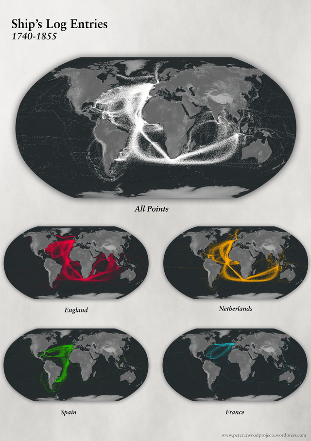 24. Карта, основанная на 280 000 записях в судовых журналах, показывает, где плавали корабли с 1740 по 1855 год