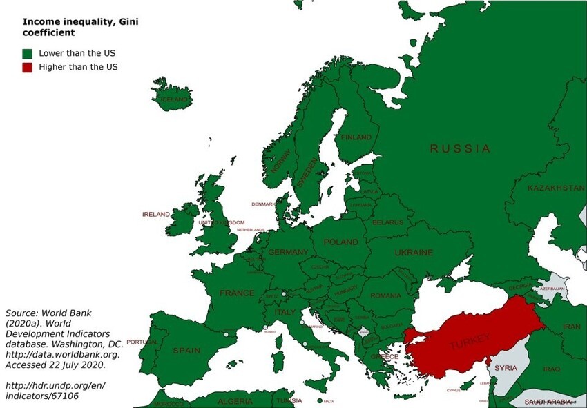 11. Неравенство доходов в сравнении с США, коэффициент Джини. Зеленым — показатель ниже, чем в США, красным — выше