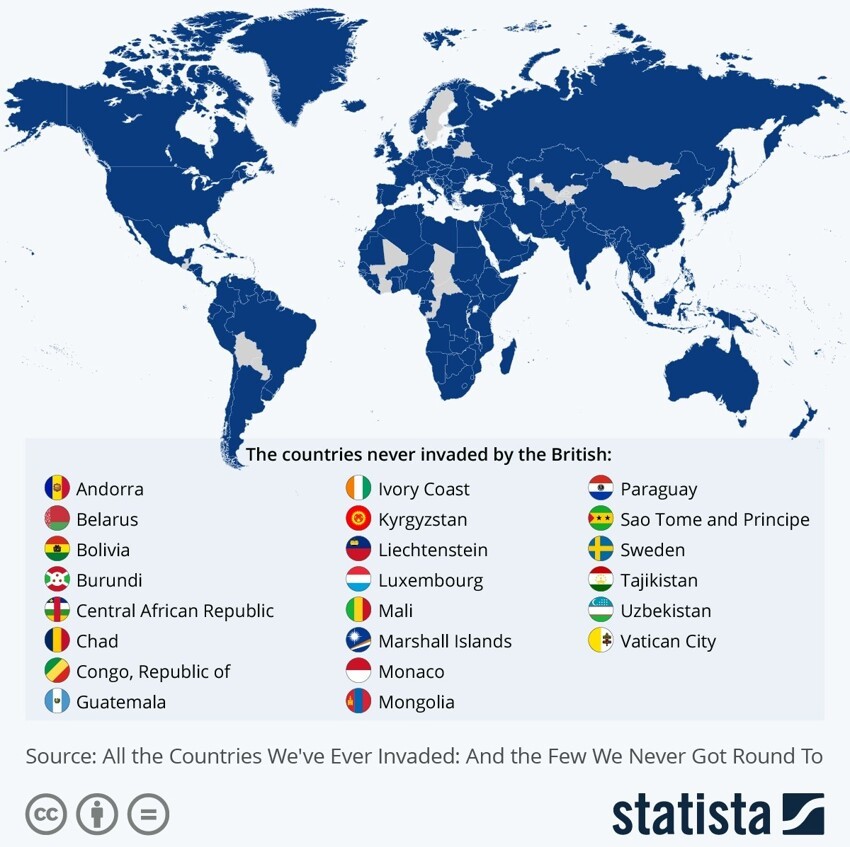 7. В мире осталось всего 22 страны, в которые никогда не вторгалась Великобритания (отмечены серым цветом)