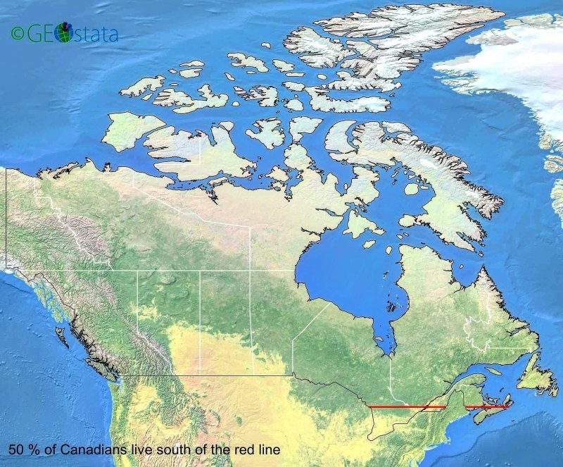 16. 50% населения Канады живут южнее красной линии