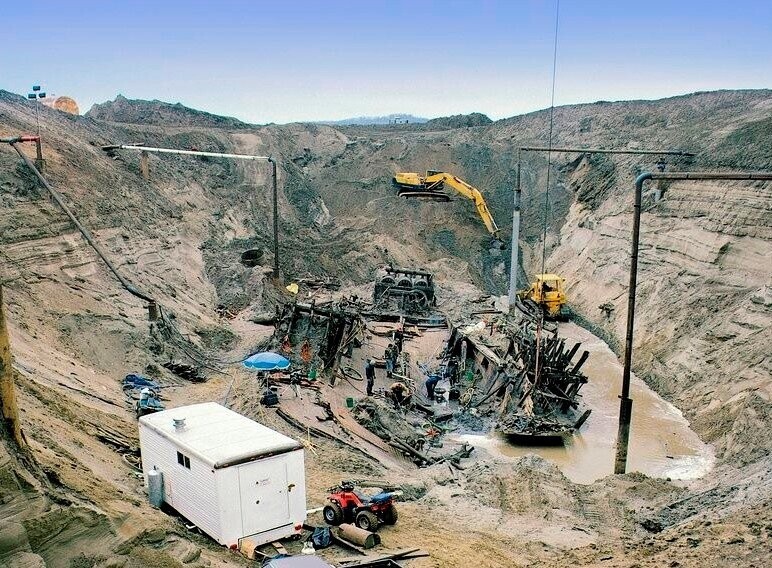 Поиски начались в июле. Поле было проверено магнитометром и выяснилось, что на глубине порядка 15 метров действительно находится крупная металлическая аномалия. В ноябре того же года начались работы по отводу грунтовых вод и непосредственно сами раскопки. Было решено проводить их зимой, когда уровень воды в реке минимальный. Первую находку сделали уже 30 ноября, это была пара обуви, а в декабре обнаружили целый ящик с товарами. Всю зиму велись работы.