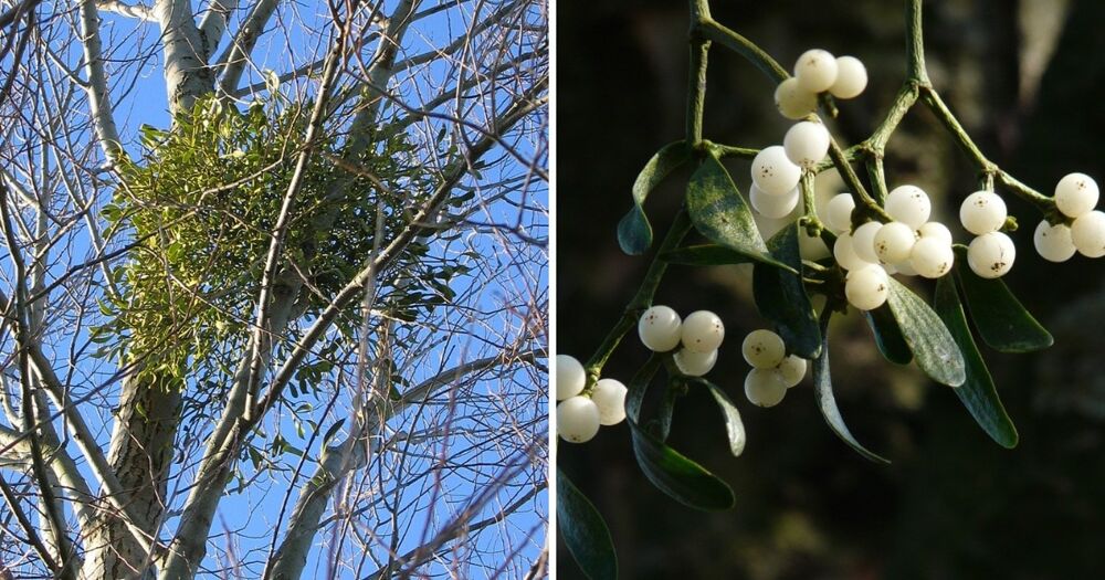 Омела способна паразитировать как на лиственных, так и на хвойных деревьях. Имеет форму шара.