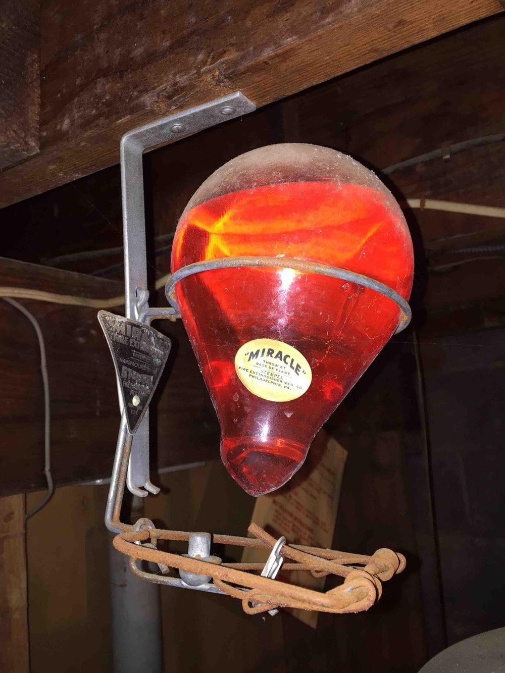 Это огнетушитель. Да, это устройство тяжело сравнивать по эффективности с современными системами пожаротушения. Но им пользовались достаточно длительное время. Внутри такого огнетушителя содержался тетрахлорметан или соляной раствор. Эта штуковина вешалась в местах с наибольшим риском возгорания.