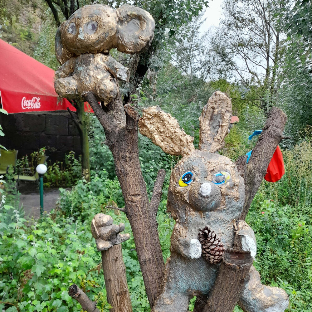 Рядом со средневековым мостом обнаружилась небольшая кафешка со свежевыловленной рыбой и видом на реку, украшенная мутантами. Экология в общем-то налицо.