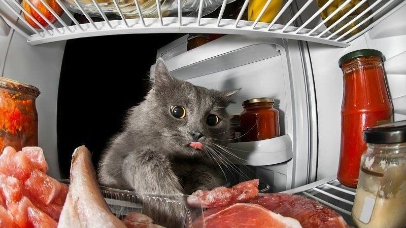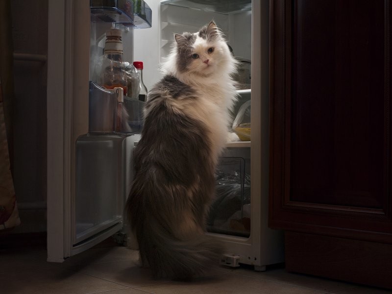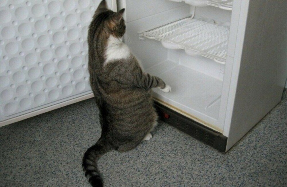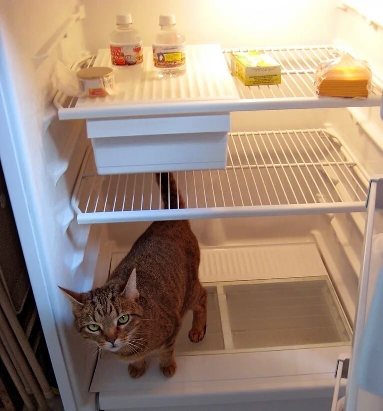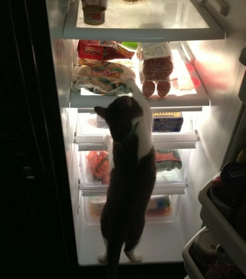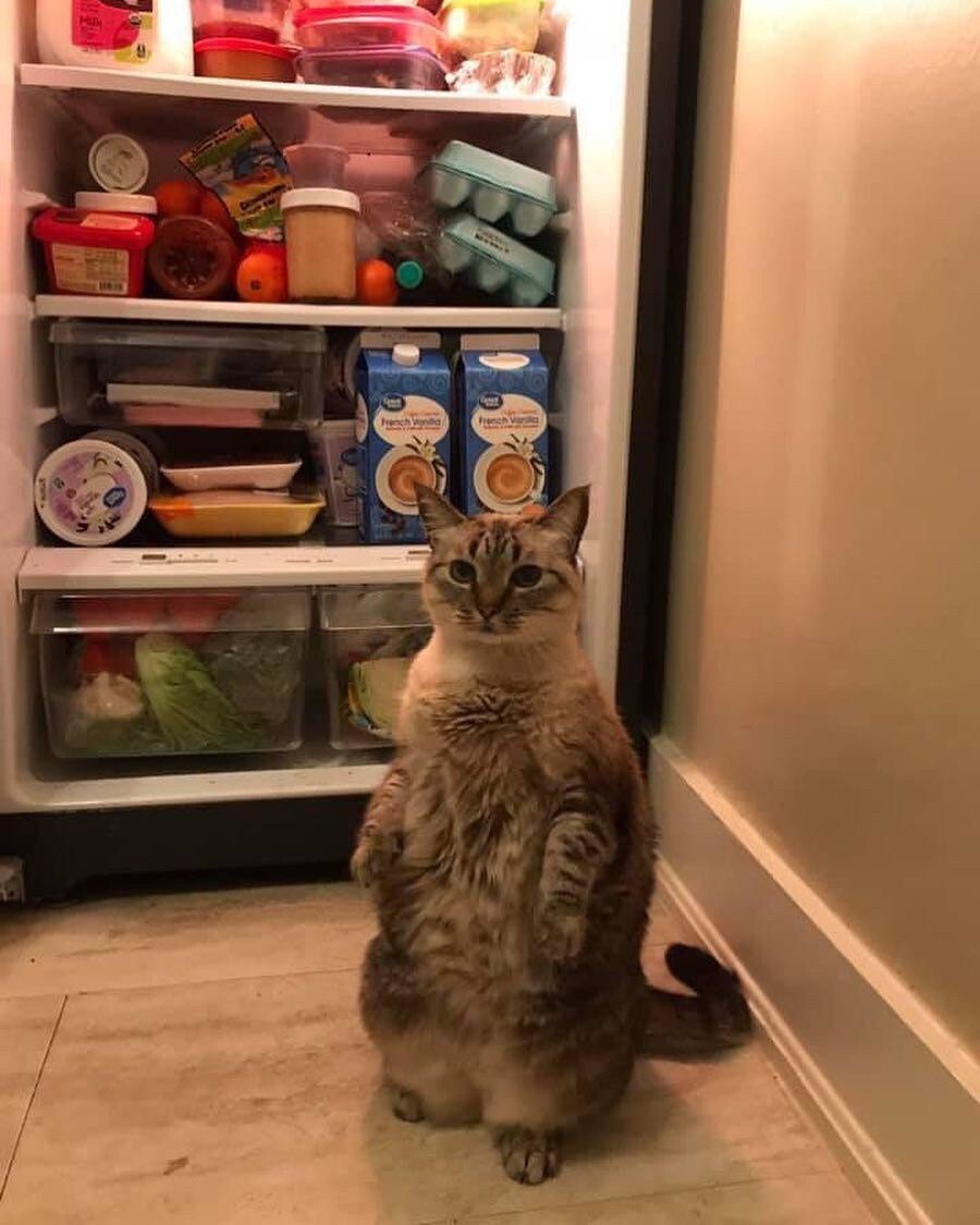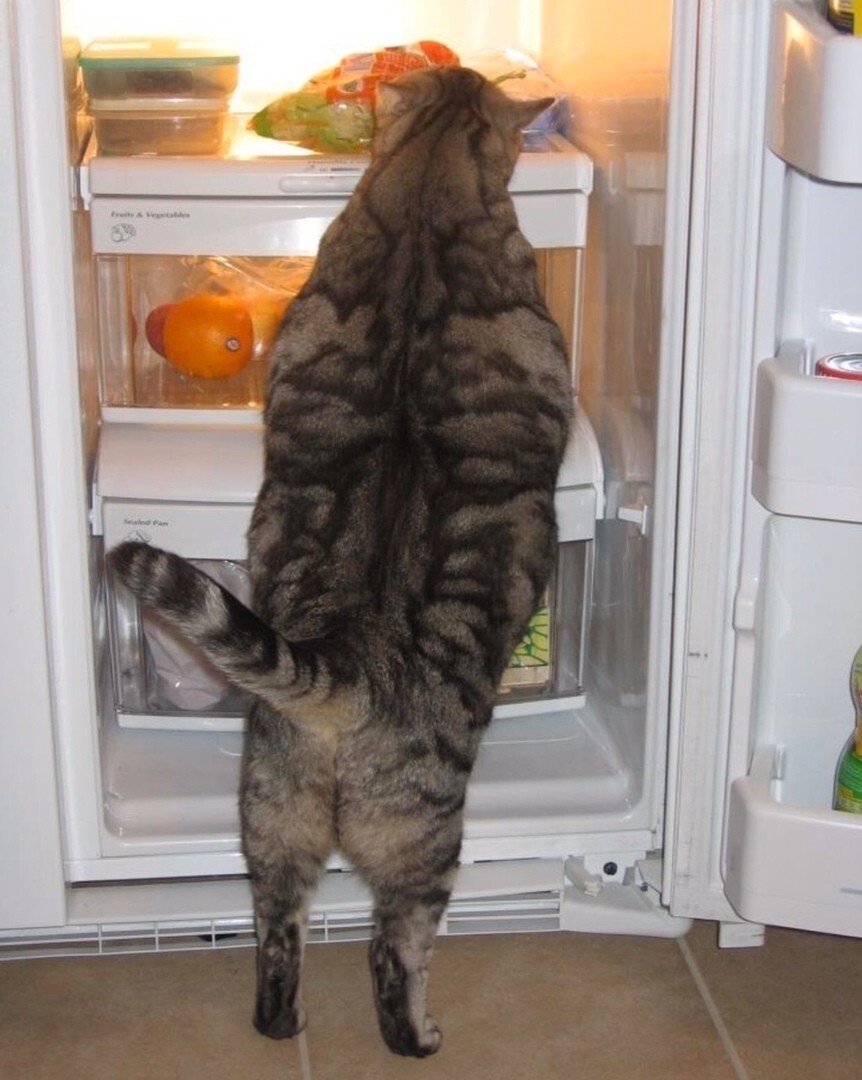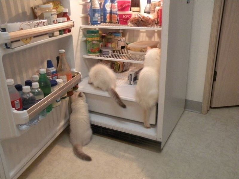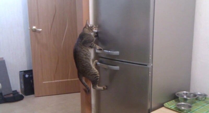 Жаль только что из-за лапок самостоятельно справиться с плотными дверцами чудо-агрегата не получается. И котикам приходится идти на всяческие ухищрения или ждать хозяина, который придёт и распахнёт приветливое нутро холодильника. И тогда уже начнётся пир.