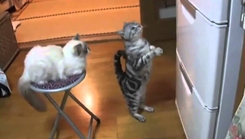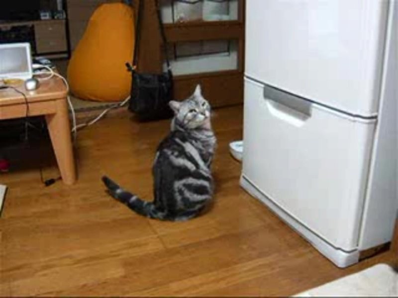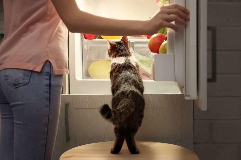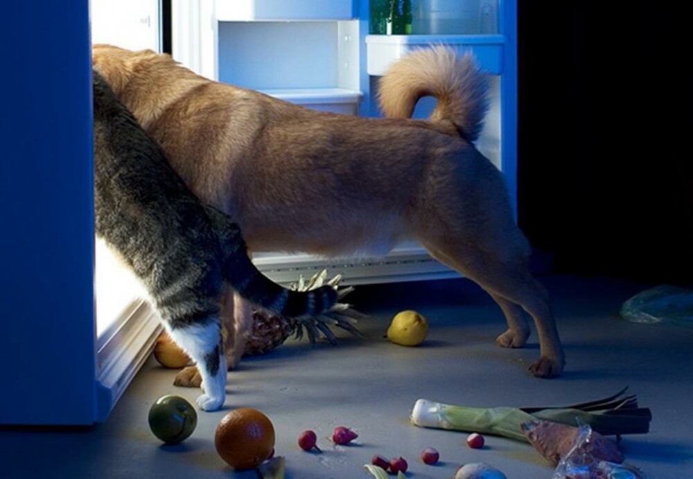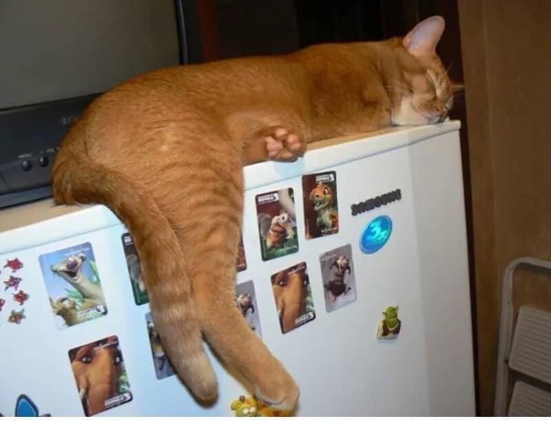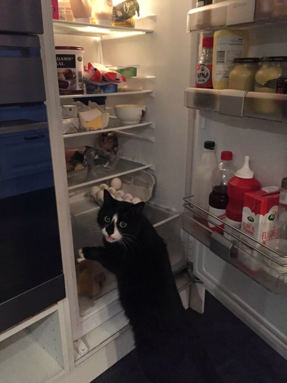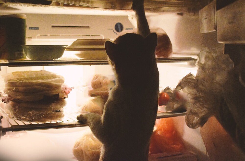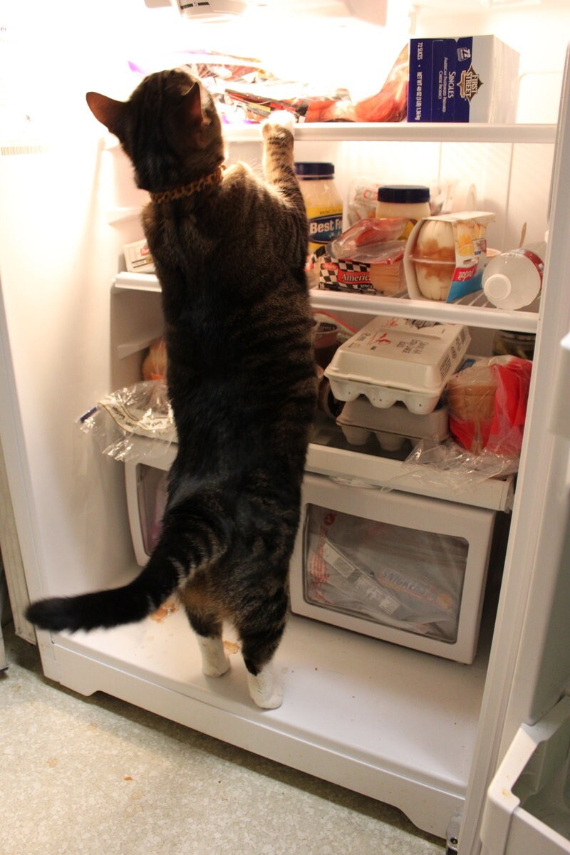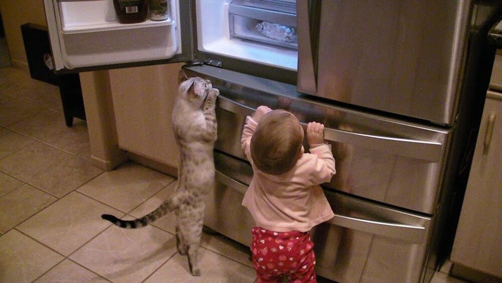 Жаль только что из-за лапок самостоятельно справиться с плотными дверцами чудо-агрегата не получается. И котикам приходится идти на всяческие ухищрения или ждать хозяина, который придёт и распахнёт приветливое нутро холодильника. И тогда уже начнётся пир.