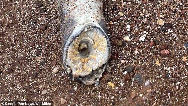 26-летний британец Уилл Майлз на прошлой неделе случайно нашел на пляже возле пристани Эксмут в Девоне странное чудище с пастью, полной оскаленных зубов. Он был так поражен, что поделился фотографиями и своими эмоциями в соцсетях.