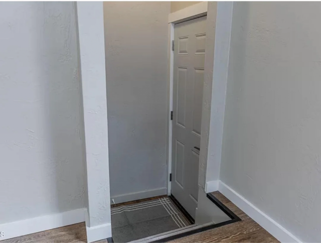 На самом деле, если присмотреться, то здесь просто миниатюрная прихожая, длиной с коврик на полу, а дверь расположена по всем правилам — в стене, а не на пустом месте.