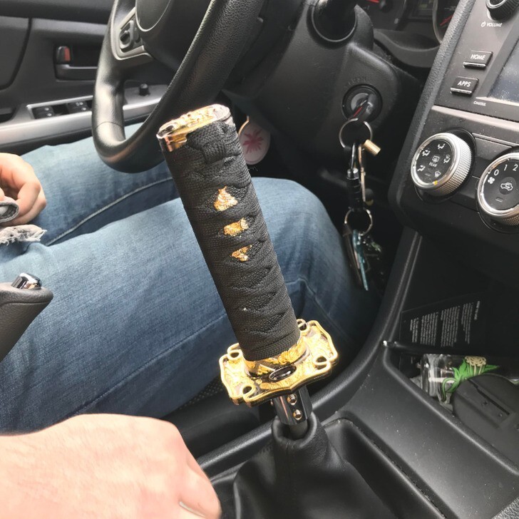 20. "Самурайский меч в качестве рычага переключения передач в машине моего брата"