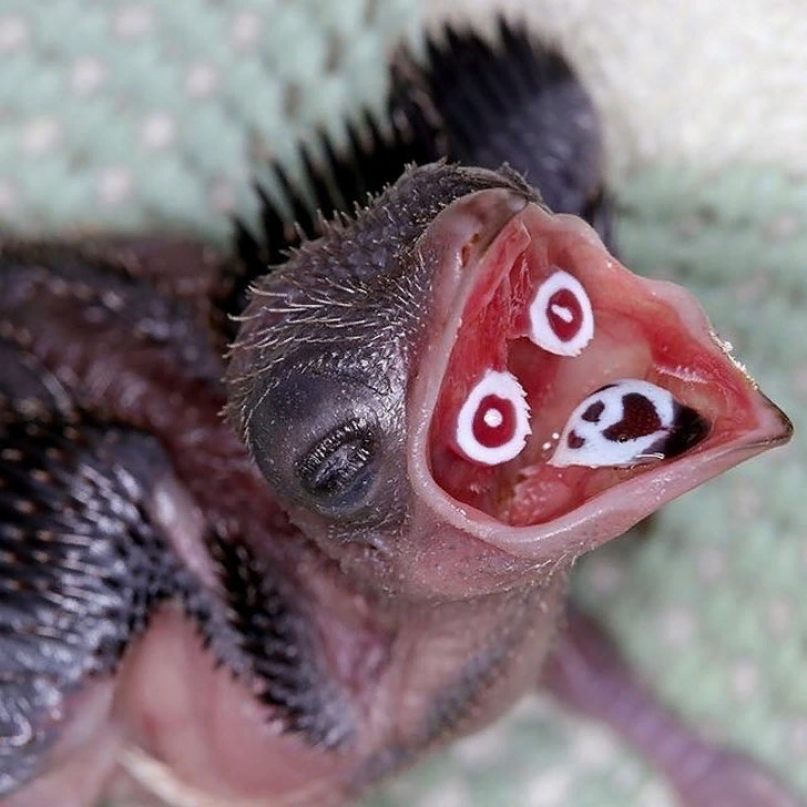 Это что, грибок, кандидоз или они пытаются кого-то напугать? Всё проще. Малыши появляются на свет практически полностью голыми и слепыми. Родители не покидают гнезда и заботятся о детишках до момента их полного взросления. Но на случай, если пернатые бунтари, всё же, забудут о своих обязанностях, во рту птенцов имеются специальные отметины. Их очертания напоминают дополнительный раскрытый клюв. Занимательный рисунок служит указателем, куда именно нужно класть еду.