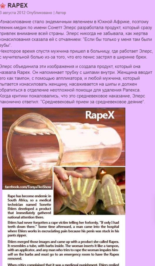 Изделие называется RapeX. Выглядит это как презерватив, внутренняя часть которого оснащена зазубринами, а наружная - гладкая. Этот девайс помещается во влагалище женщины точно как тампон, но работает он иначе: любая попытка совершить фрикцию приведёт к тому, что зазубрины вопьются в половой орган мужчины. Освободить член от RapeX будет крайне непросто и, скорее всего, - только хирургическим путём.