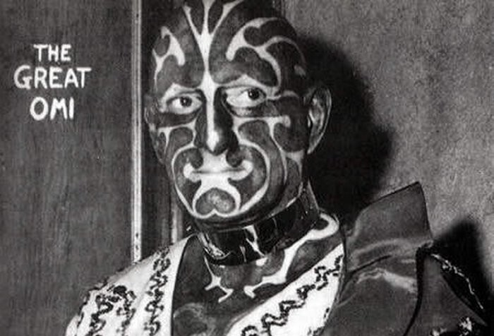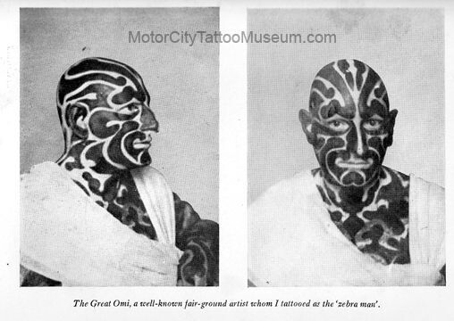 Великий Оми был одним из самых популярных татуированных людей всех времён. Основную часть тела, включая голову и лицо мужчины, покрывали узоры, напоминающие чёрно-белый рисунок зебры. Поэтому Горация Ридлера, как в миру звали этого героя, часто называли и Человек-зебра.