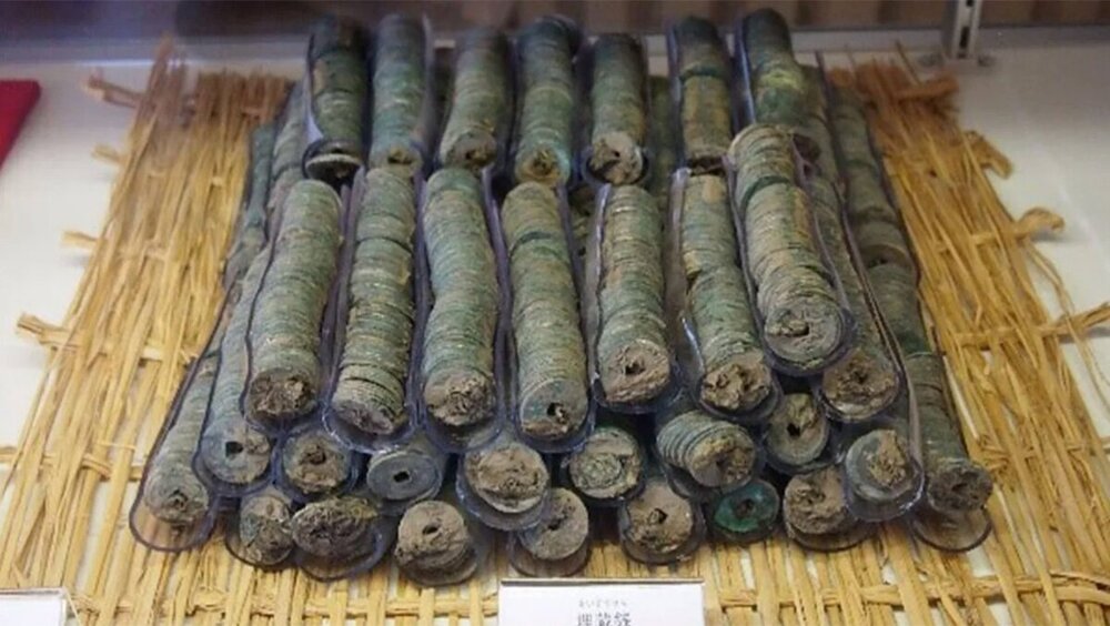 Во время проекта строительства фабрики к северу от Токио рабочие обнаружили закопанный тайник, содержащий около 100 тысяч монет. Находка была разделена на 1060 пачек и датирована периодом между 175 г. до н. э. и 1265 г. н. э. Первая была произведена в Китае и содержит китайскую надпись «Баньлян», что переводится как «половина унции». На данный момент исследователи изучили около 334 монет.