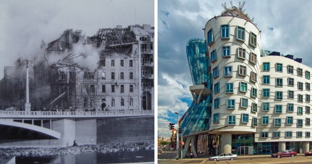 Танцующий дом был построен в 1996 году. На фото слева это же здание, но после бомбардировки в 1945 году.