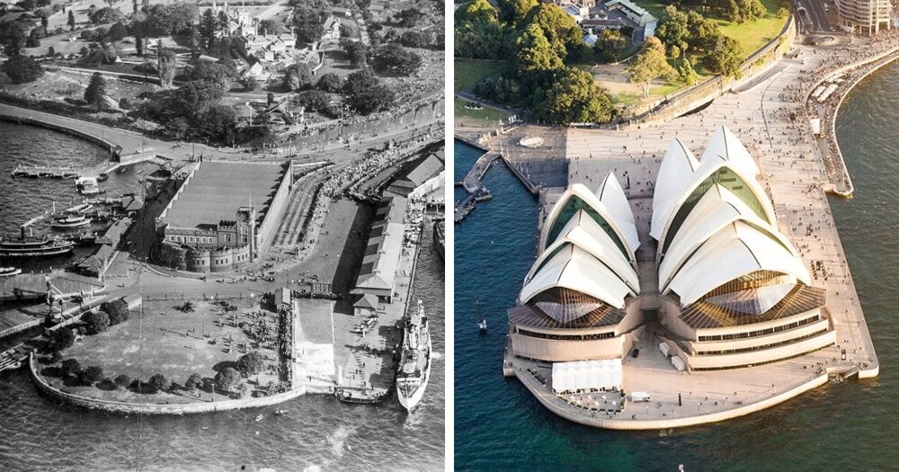 4. Гавань Порт-Джэксон на мысе Беннелонг в Сиднее до и после строительства сиднейского оперного театра
