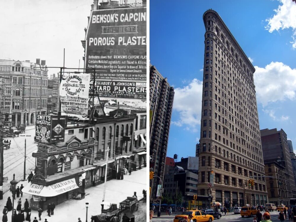 8. Соединение Бродвея, Пятой авеню и восточной 23-й улицы в Нью-Йорке до и после строительства Флэтайрон-билдинг
